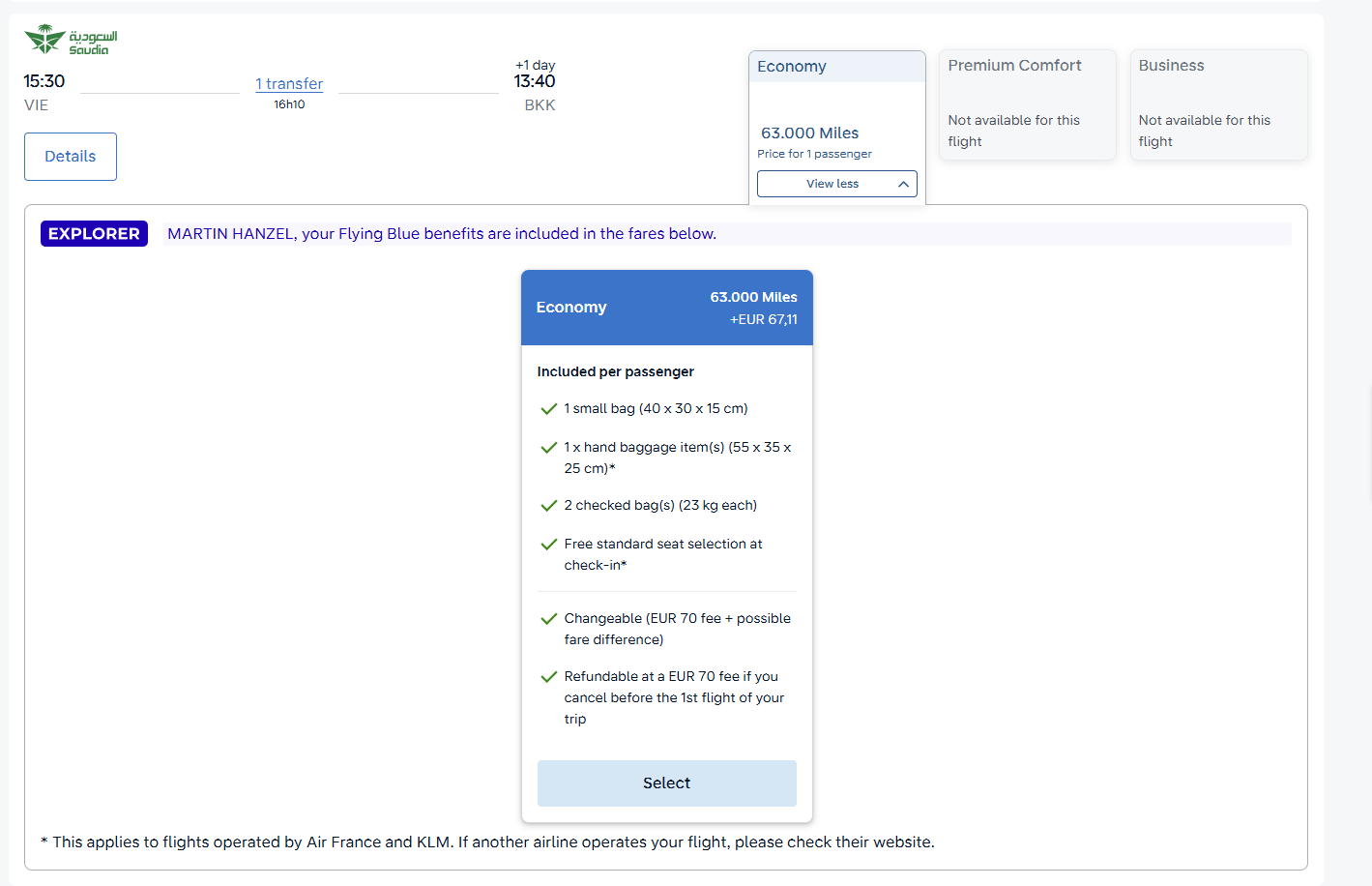 a bohuzial nie… To ze Saudia letenka stoji 320 Eur cash v economy, neznamena ze zaplatis 160 Eur v hotovosti a zvysok Flying Blue milami…